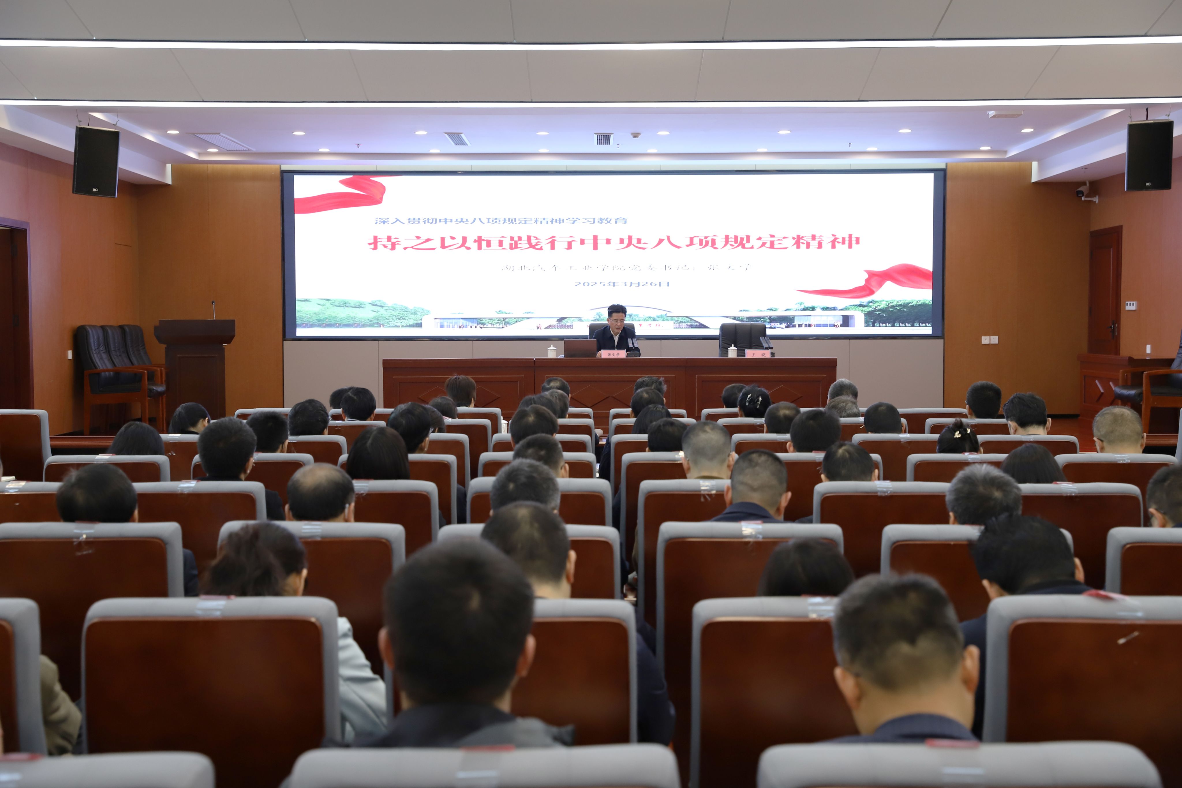 张文学指出,高校承担着立德树人的根本任务,肩负着培养社会主义建设者和接班人的历史使命,更应发挥好“源头活水”的作用,营造风清气正的育人环境。要加强学习教育,筑牢思想防线,把中央八项规定精神作为党员干部的必修课,做到内化于心、外化于行,使铁的纪律真正转化为日常习惯和自觉遵循;要推动全面从严治党,强化责任落实,将中央八项规定精神与学校重点工作结合,嵌入领导干部能力提升、机关作风整治等行动中,强化政治监督,压实责任链条,深化风腐同治,严纠作风顽疾,提升治理效能;要坚持以上率下,发挥“头雁效应”,把落实中央八项规定精神作为领导干部的重要政治任务,带头遵守、带头执行,以身作则、率先垂范,不断加强干部能力作风建设,提高决策效率和执行效率;要坚持师生为本,树牢服务宗旨,领导干部要从自身做起,从点滴做起,做到关爱师生,服务师生,要“身、心、脑”都在一线,身体力行带头干,真心实意关心人,脚踏实地想问题;要坚持问题导向,持续深化整改,聚焦作风建设中的突出问题,聚焦师生身边的“关键小事”和学校发展的“关键大事”开展集中整治,进一步推动“高效办成一件事”工作目标稳步落实。